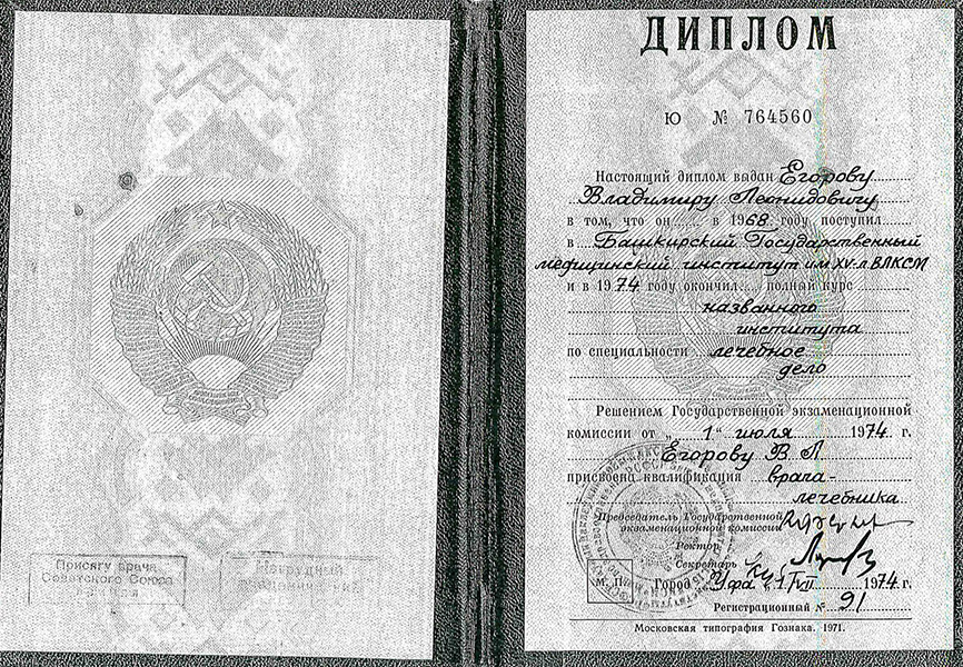 Башкирский медицинский институт, 1974 год. 1974 - 1975гг. – интернатура на базе республиканской клинической больницы г. УФА, врач невропатолог.